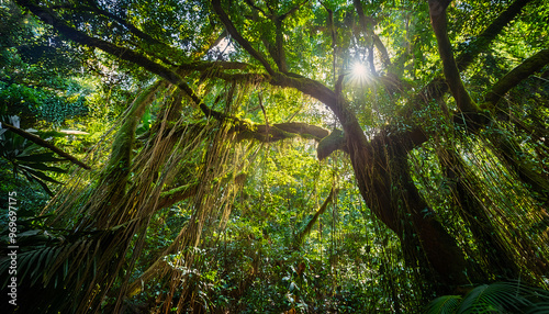 © Matthias, Fototapeta premium Jungle Canopy- A Close-Up of Intertwined Tree Branches and Leaves with Sunlight Peeking