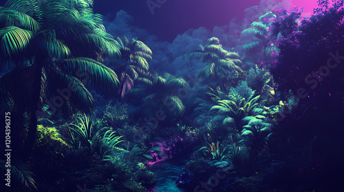 © Thiago, Fototapeta premium Jungle landscape glowing neon at night, made with generative ai. Neon Jungle. Illustration