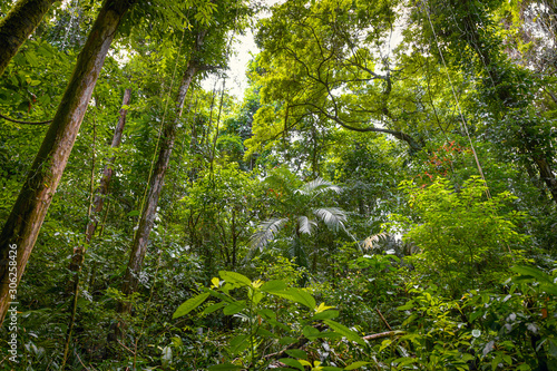 Naklejka premium Jungle. Landscape in the middle of the rainforest with tall trees and sun rays