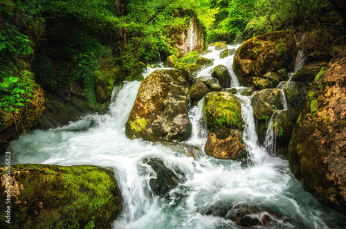© Biskariot, Obraz premium Jungle landscape with flowing turquoise water of georgian cascade waterfall at deep green forest. Mountain of georgia