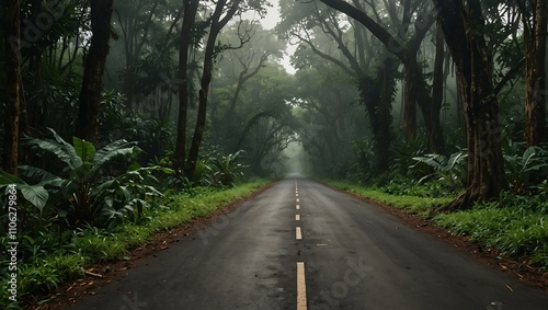 © claudunia, Obraz premium Jungle road with trees on both sides.