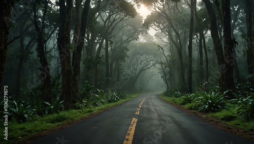 © claudunia, Obraz premium Jungle road with trees on both sides.