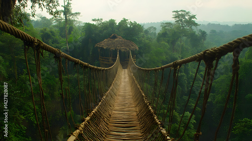 Fototapeta premium Jungle Rope Bridge: Trek Across Lush Canopy