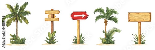 Naklejka premium Jungle-themed wooden signboard collection, including directional pointers,...