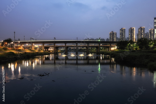 © aaron90311, Naklejka premium Jungnangcheon stream and subway bridge