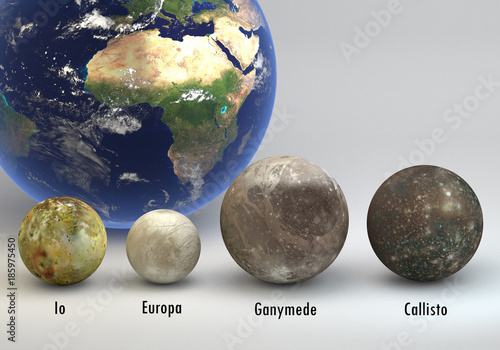 Naklejka premium Jupiter moons with Earth comparison with captions