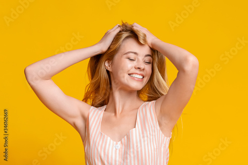 Fototapeta premium Just Happy. Joyful Teen Girl Touching Her Hair Standing Over Yellow Background