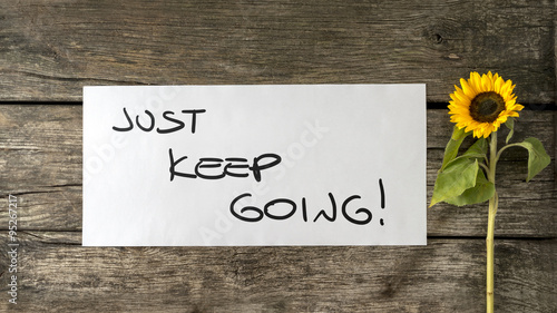 © Gajus, Naklejka premium Just keep going message written on white card lying next to a bl