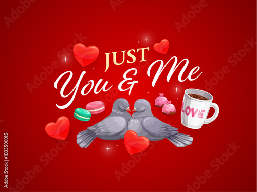 Naklejka premium Just you and me valentine day greetings quote. Vector love valentines day phrase. Romantic message featuring two cartoon doves surrounded by hearts, sparks, mug of coffee or desserts on red background