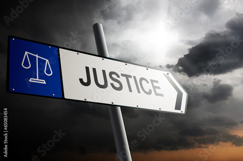 © Zerophoto, Obraz premium Justice direction. Blue traffic sign.