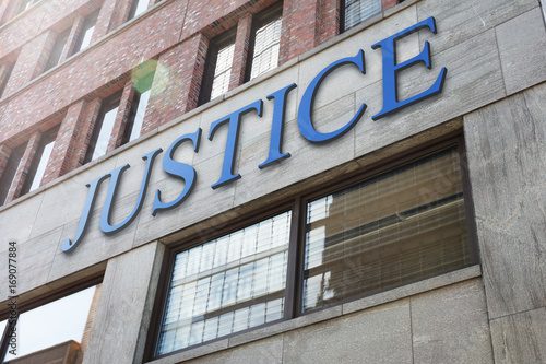© Andrey Popov, Obraz premium Justice sign on modern building in city
