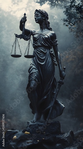 © Ayo, Fototapeta premium Justice statue, scales, sword, misty forest