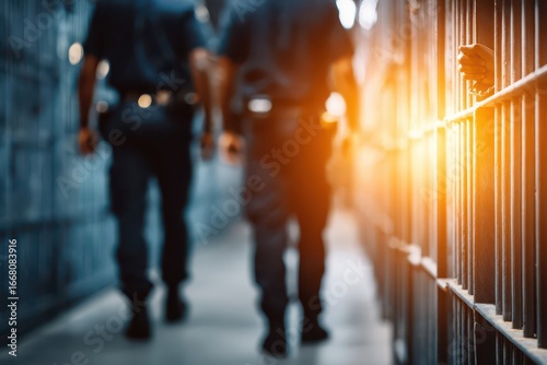 Fototapeta premium Justice System: Hand behind prison bars, blurred officers, dramatic light.