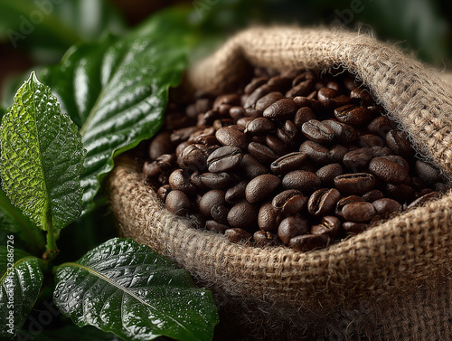© Silent26, Obraz premium Juta worek wypełniony palonymi ziarnami kawy, otoczony świeżymi, zielonymi liśćmi kawowca. Symbol naturalności i jakości produktu kawowego.