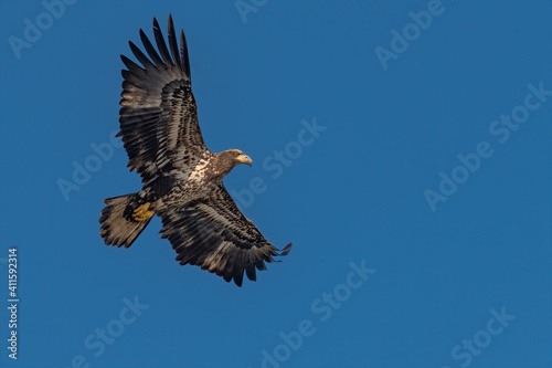 Obraz premium Juvenile Bald Eagle Flying in the Blue Sky over the Susquehanna River