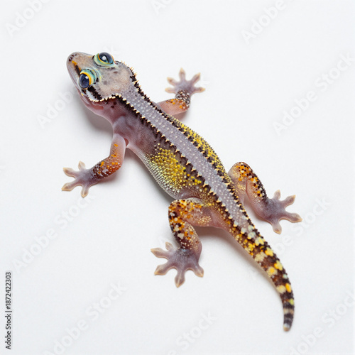 © GMeta, Obraz premium Juvenile gecko with translucent skin and bright eyes on a white background