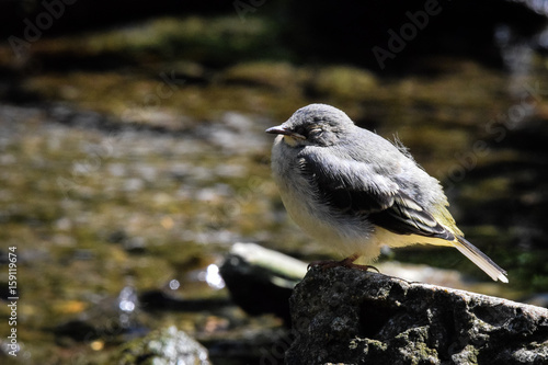 © Anders93, Naklejka premium Juvenile grey wagtail (Motacilla cinerea) fledgling wild bird perched on a rock on the river bank