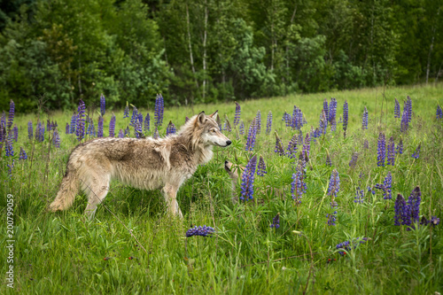 Fototapeta premium Juvenile Grey Wolf (Canis lupus) and Pup Stand in Field of Lupine