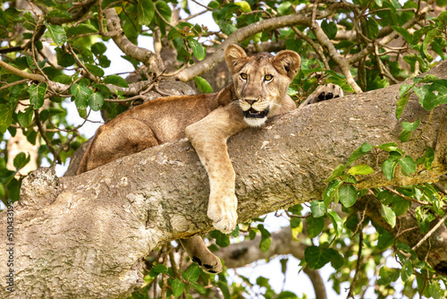 Naklejka premium Juvenile lion in a tree. The Ishasha sector of Queen Elizabeth National Park is famous for the tree climbing lions, who climb to escape heat and insects, and have a clear vantage point.