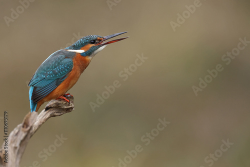 Fototapeta premium Juvenile or adult female common kingfisher (alcedo atthis) open its beak