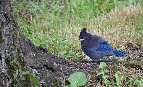 © Diane, Obraz premium Juvenile Steller's Jay standing on the ground. Green grass in background.