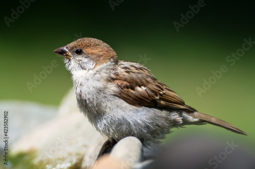 © Milan, Fototapeta premium Juvenile Tree sparrow (Passer montanus) on the stones. Czechia. Europe.
