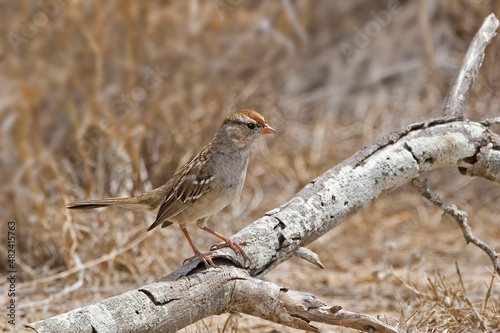 Fototapeta premium Juvenile White-crowned Sparrow, Zonotrichia leucophrys, perched on a log