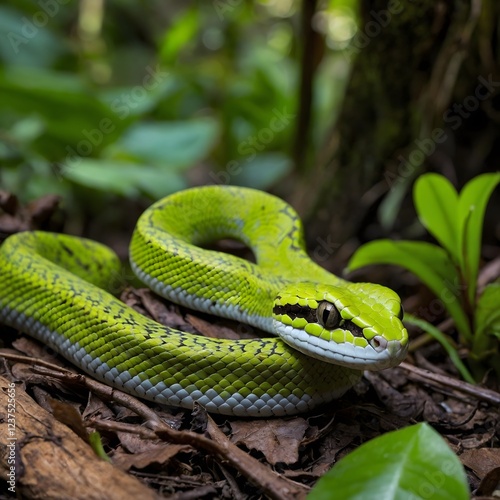 Fototapeta premium Juvenile White Lipped Pit Viper Exploring the Forest Floor with Unique Markings