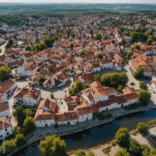 © Atif, Obraz premium 4K cinematic aerial view of a quiet European village with cobblestone streets, pure white background