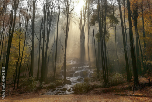 © 25alley studio, Obraz premium 8k highest resolution. sunrise in a dense forest, fall forest, woods with fog, woods and river, capturing the golden light filtering through the trees. Sunlight though trees