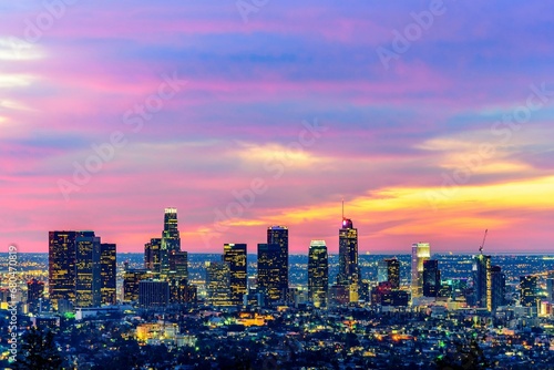 Obraz premium 4K Image: Los Angeles Skyline During Twilight with Setting Sun - Urban Sunset View