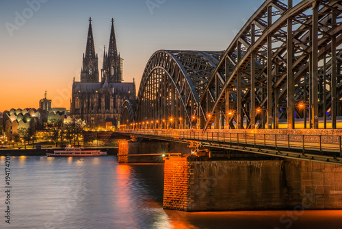 Fototapeta premium Köln – Dom und Hohenzollernbrücke bei Sonnenuntergang