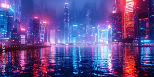 © Orod, Fototapeta premium 8K premium advertisement showcasing a vibrant nighttime cityscape with colorful lights reflecting on water, perfect for urban and travel promotions