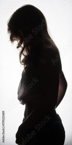 Fototapeta premium körper, frau, silhouette, leitbild, brust, schönheit, schwangerschaft, bauch, person, black, haar, gestalten, profil, back, dark, mama, abspecken, leute, abbildung, schatten, kunst, atelier, sinnlich