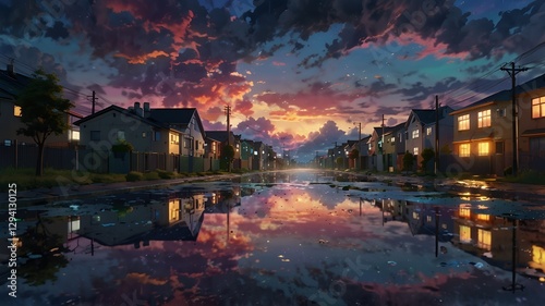 Fototapeta premium 🌈 8K Ultra HD Anime Scenery – Magical Dusk Alley with Reflective Puddles,...