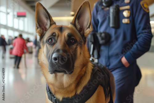 © Mayava, Obraz premium K-9 unit with a security officer, conducting routine checks around the airport terminal