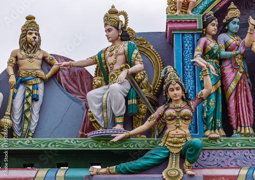 © Klodien, Fototapeta premium Kadirampura, Karnataka, India - November 4, 2013: Sri Murugan Temple. Colorful statues, closeup of emissionary lecturing Surapadman wirh brother Singamukhan behind him