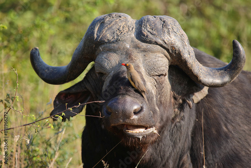 © Ludwig, Naklejka premium Kaffernbüffel und Rotschnabel-Madenhacker / African buffalo and Red-billed oxpecker / Syncerus caffer et Buphagus erythrorhynchusuphagus erythrorhynchus