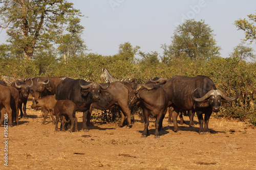 Obraz premium Kaffernbüffel und Steppenzebra / Buffalo and Burchell's zebra / Syncerus caffer et Equus burchellii.