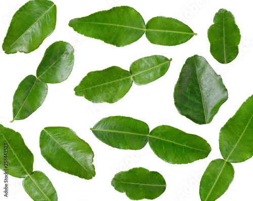 © dasuwan, Obraz premium kaffir lime leaves on white background