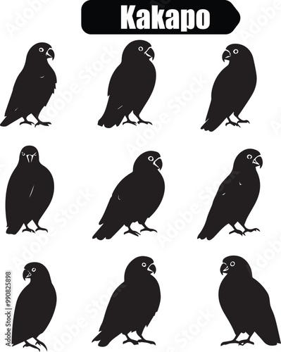 Naklejka premium Kakapo Parrot Silhouette Vector Illustration: Endangered New Zealand Bird Graphic, Wildlife Conservation Art, Black and White Design, Bird Icon Set