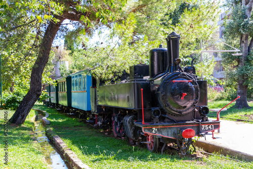 Fototapeta premium Kalamata, Greece, July 21, 2022. Old train in the Municipal Railway Park of Kalamata.