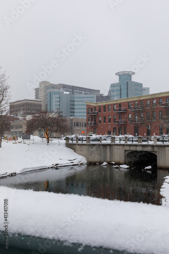 © Daniel, Naklejka premium Kalamazoo, Michigan, USA - February 5 2021: Downtown Kalamazoo in snow. view from Arcadia Creek playground.