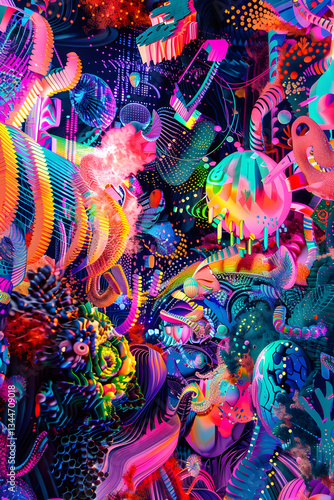 © Ola, Fototapeta premium Kaleidoscope of Neon Shapes: A VJ Graphics Journey Synced with Music Beats