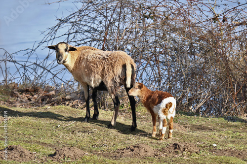 © ReNi, Obraz premium Kamerunschaf Mutterschaf mit Lamm bei Sonnenschein auf einem Bauernhof