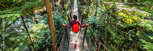 © Maridav, Fototapeta premium Kanada podróży transparent styl życia ludzi. Turystyczna kobieta spacerująca w słynnej atrakcji Capilano Suspension Bridge w North Vancouver, British Columbia, kanadyjskim miejscu wypoczynku dla turystyki.