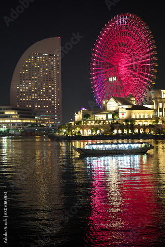 © Khun Ta, Naklejka premium Kanagawa,Japan-December 1, 2019: Colorful Ferris Wheel at night