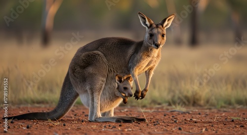 © odzie, Fototapeta premium Kangaroo Mother with Joey in Pouch Standing in Golden Hour Light
