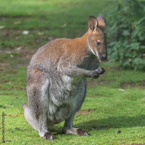 Fototapeta premium Kangaroo standing on the grass, licking itself fingers