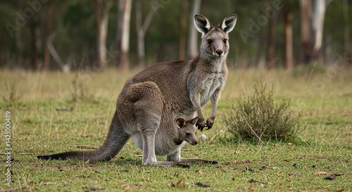 © Vanier Johanne, Fototapeta premium Kangaroo Standing with Joey in Pouch on Grassy Field